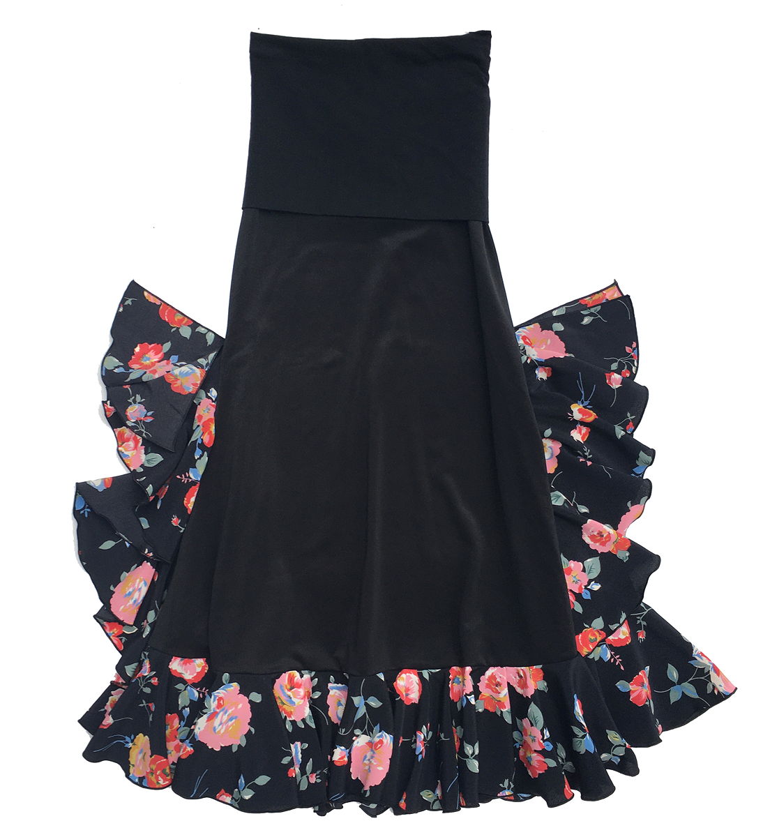 Seitlich hochgezogene Volantes.